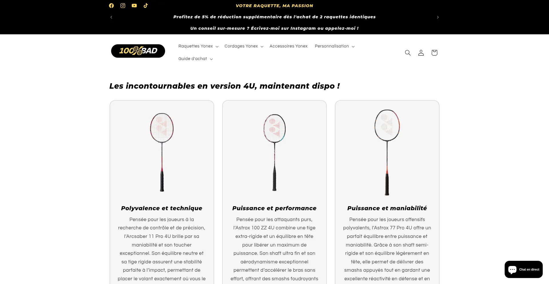 Découvrez 100%BAD, votre boutique en ligne spécialisée dans les raquettes de badminton. Nous proposons une large gamme de raquettes Yonex. Bénéficiez de conseils d'experts ...
