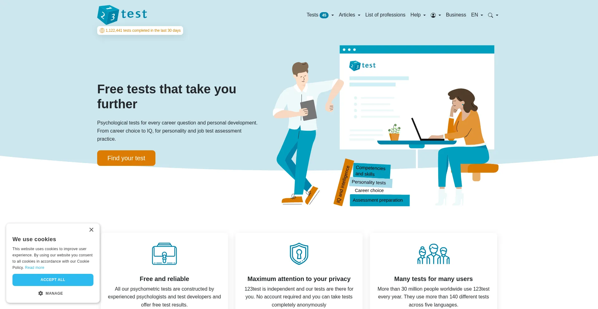 The website implements cookie consent mechanisms in compliance with privacy regulations such as GDPR or CCPA. This demonstrates that 123test.com adheres to data protection standards and provides users with control over personal data collection practices.