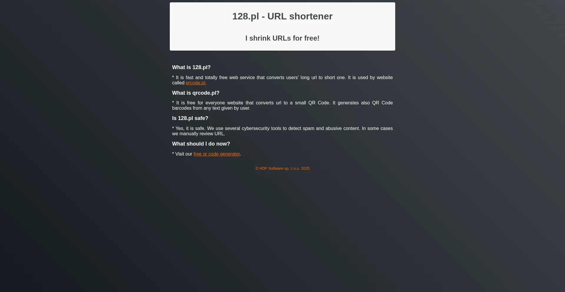 128.pl is a free online url shortener used by website qrcode.pl