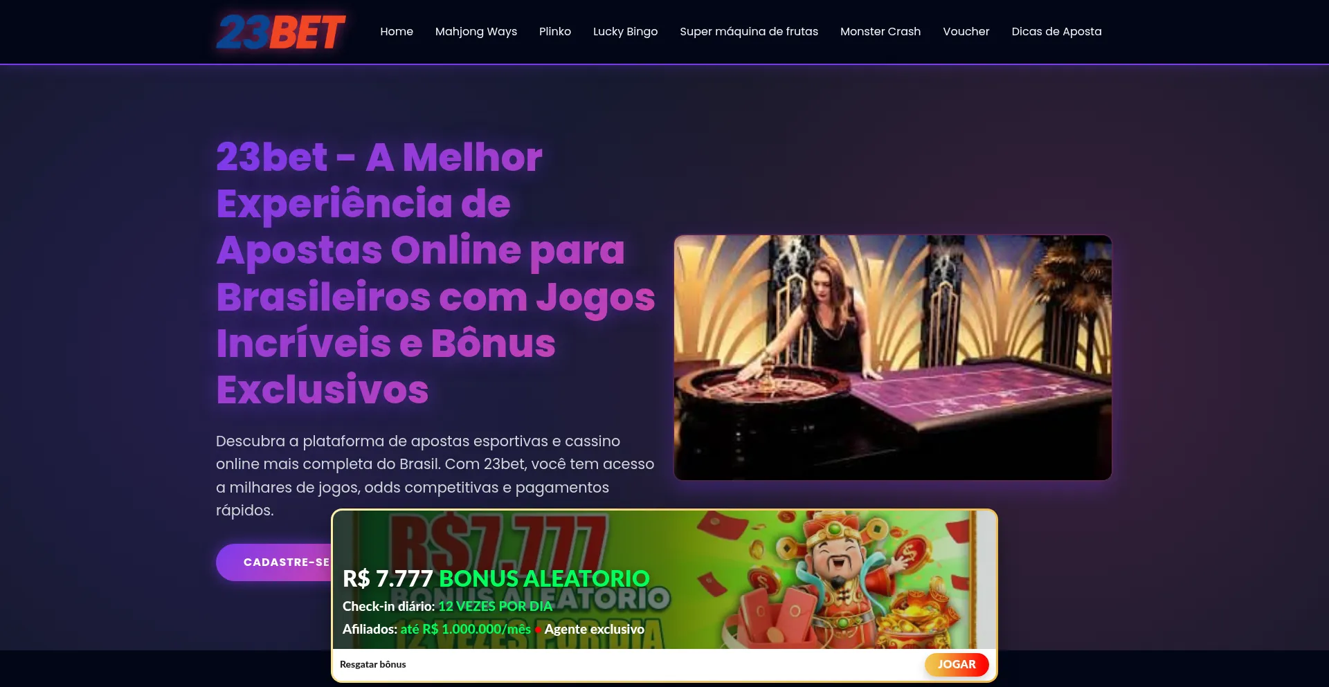 23bet oferece as melhores apostas esportivas, cassino ao vivo e jogos online no Brasil. Bônus exclusivos, pagamentos rápidos e suporte 24/7.