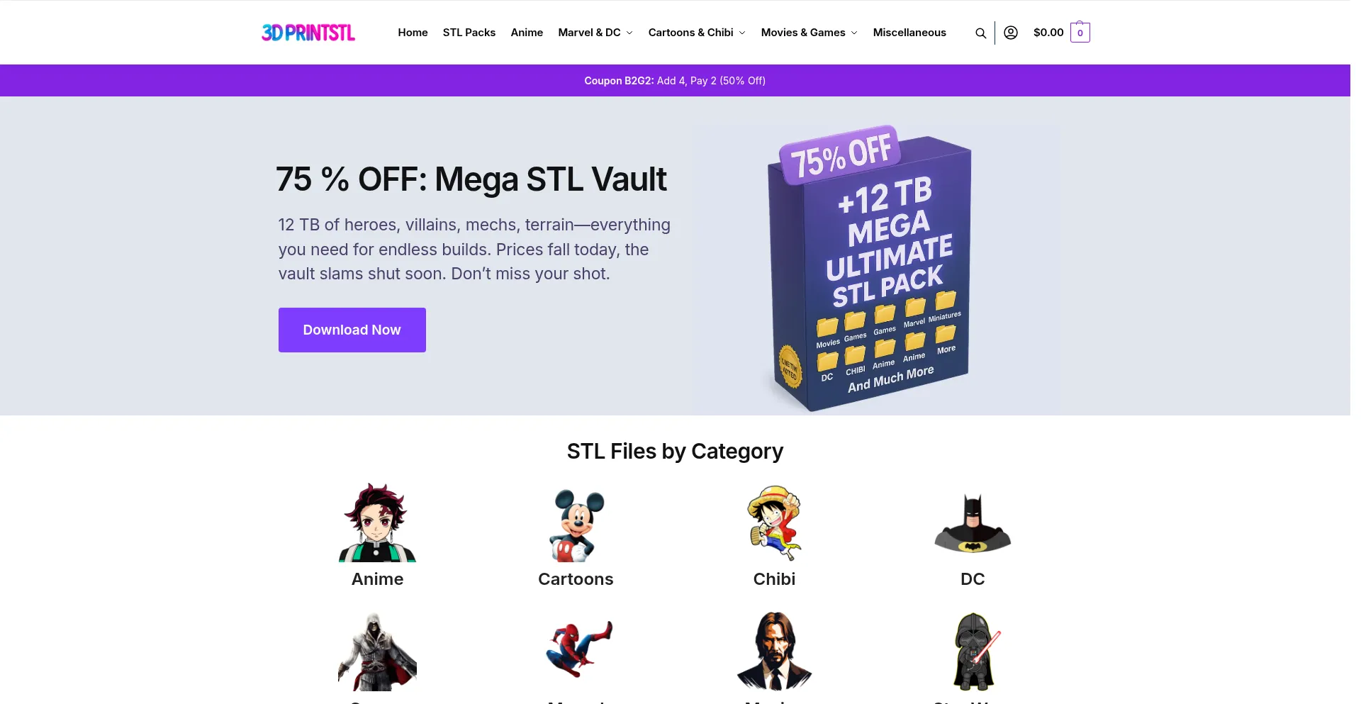 Grab premium, affordable STL models for 3D printing: anime, Marvel, DC, Star Wars, video games & more—12 TB ready for instant download at 3DPrintSTL.