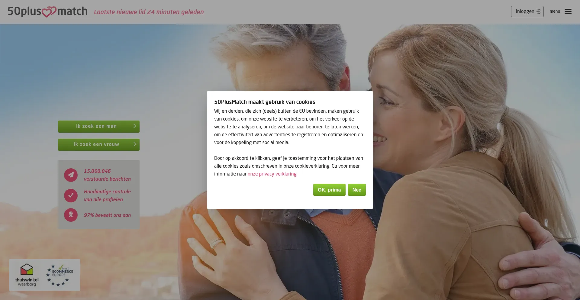 The website displays security certifications or trust seals from recognized authorities, indicating compliance with security standards, data protection protocols, or industry regulations. Trust seals from 50plusmatch.nl suggest adherence to established security practices and operational transparency.