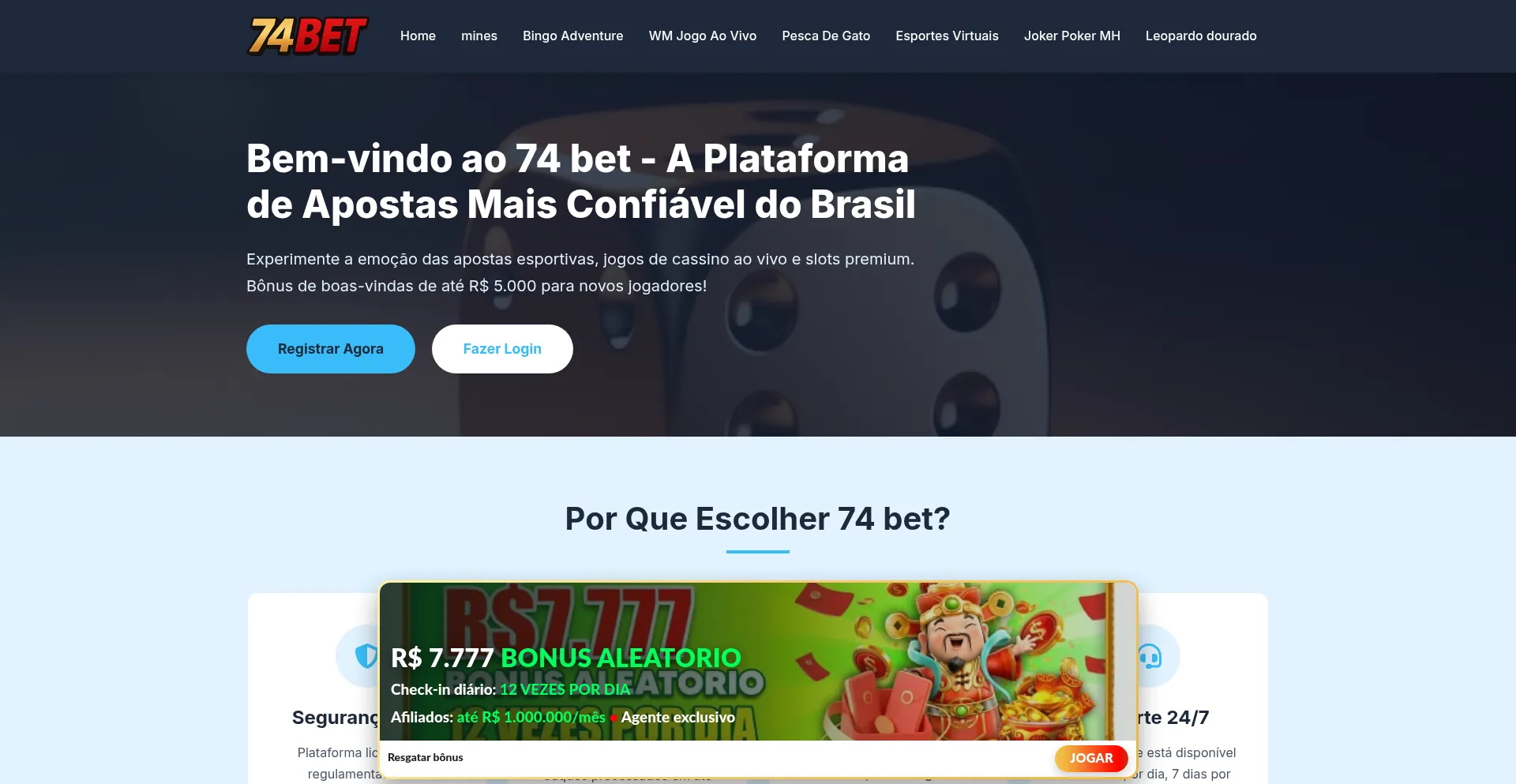 74 bet oferece as melhores apostas esportivas, jogos de cassino ao vivo e slots online. Bônus exclusivos, pagamentos rápidos e suporte 24/7 para jogadores brasileiros.