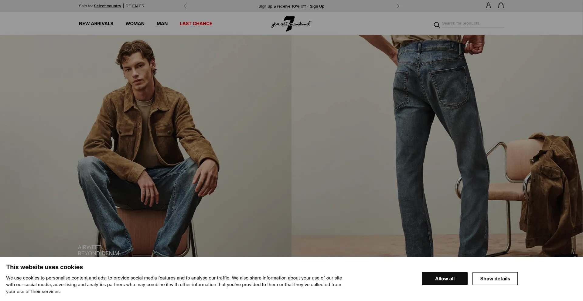 The website implements cookie consent mechanisms in compliance with privacy regulations such as GDPR or CCPA. This demonstrates that 7forallmankind.eu adheres to data protection standards and provides users with control over personal data collection practices.