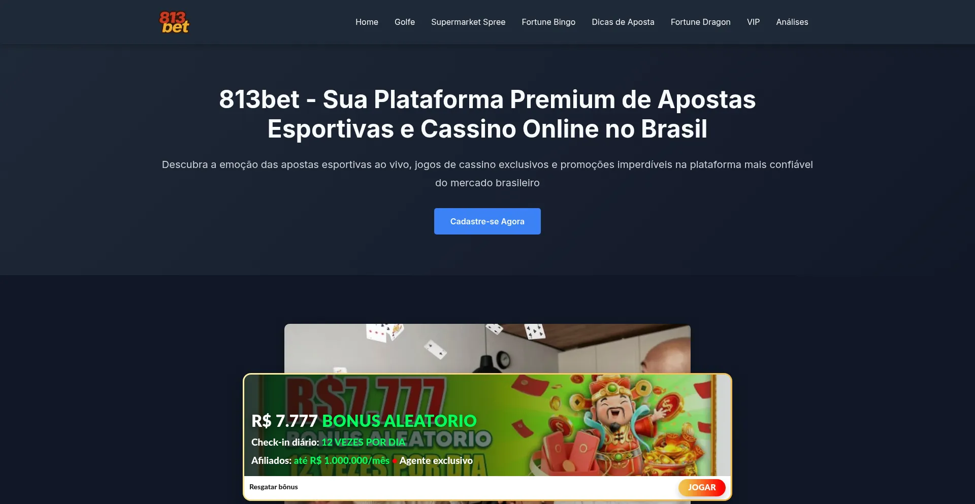 813bet oferece as melhores apostas esportivas, cassino ao vivo e jogos de slots no Brasil. Bônus exclusivos, odds competitivas e segurança garantida.