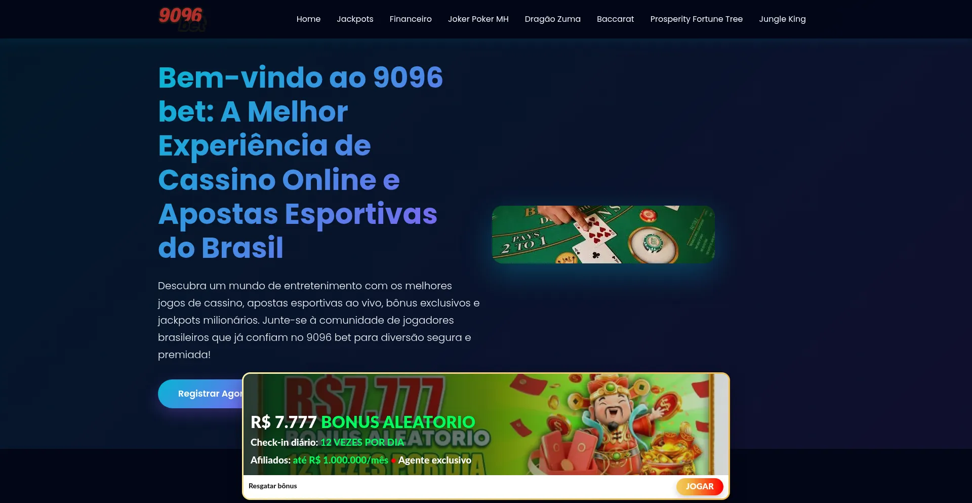 9096 bet oferece os melhores jogos de cassino online, apostas esportivas e jogos ao vivo para jogadores brasileiros. Bônus exclusivos e jackpots incríveis!
