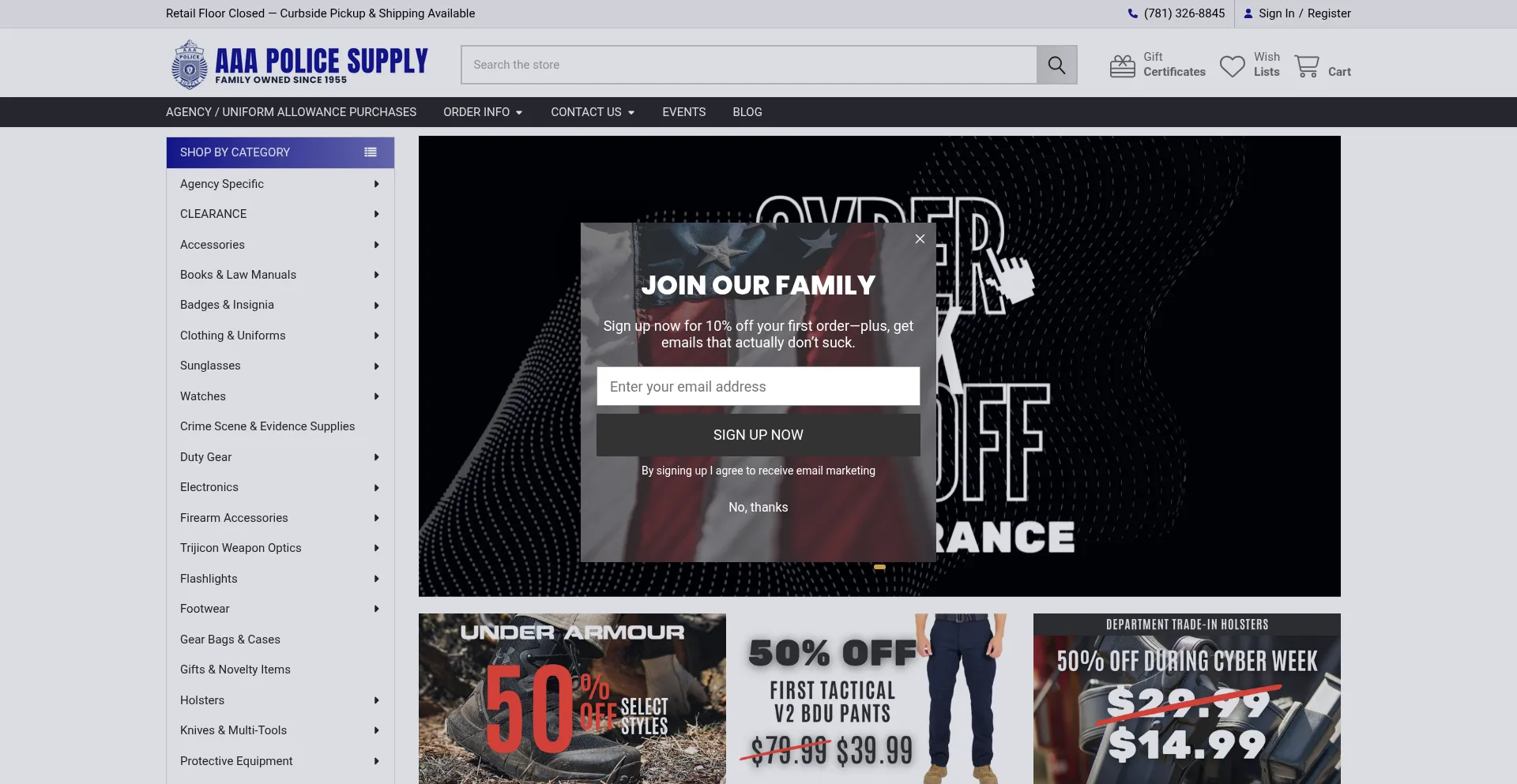 The aaapolicesupply.com website implements data collection forms that may request personal information including names, email addresses, phone numbers, or other sensitive details. Users should verify the legitimacy of it and review privacy policies before submitting personal data.