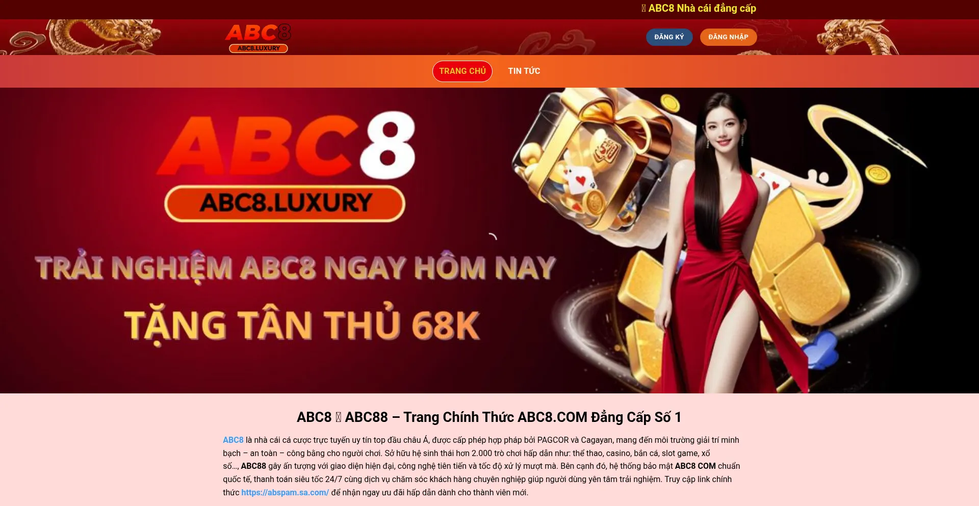 ABC8 là nhà cái cá cược trực tuyến uy tín top đầu châu Á, được cấp phép hợp pháp bởi PAGCOR và Cagayan, mang đến môi trường giải trí min...