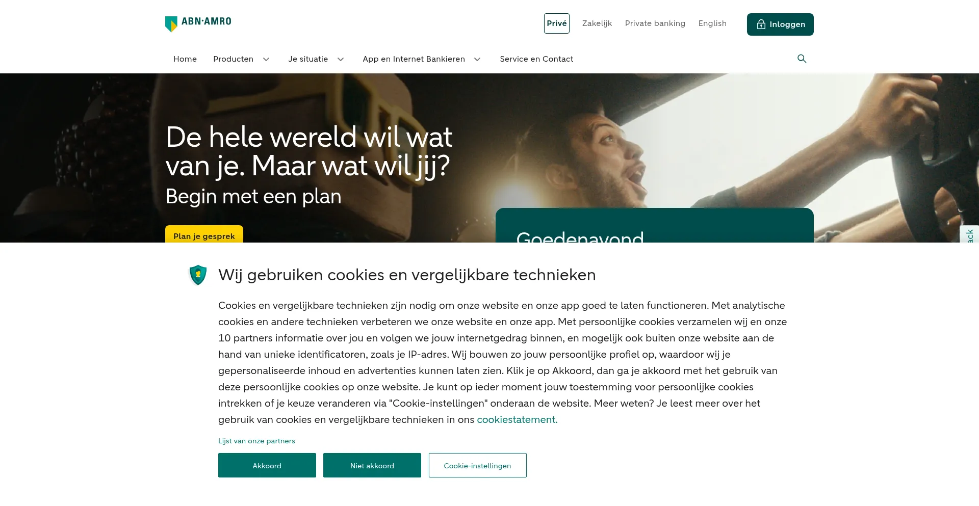 The website implements cookie consent mechanisms in compliance with privacy regulations such as GDPR or CCPA. This demonstrates that abnamro.nl adheres to data protection standards and provides users with control over personal data collection practices.