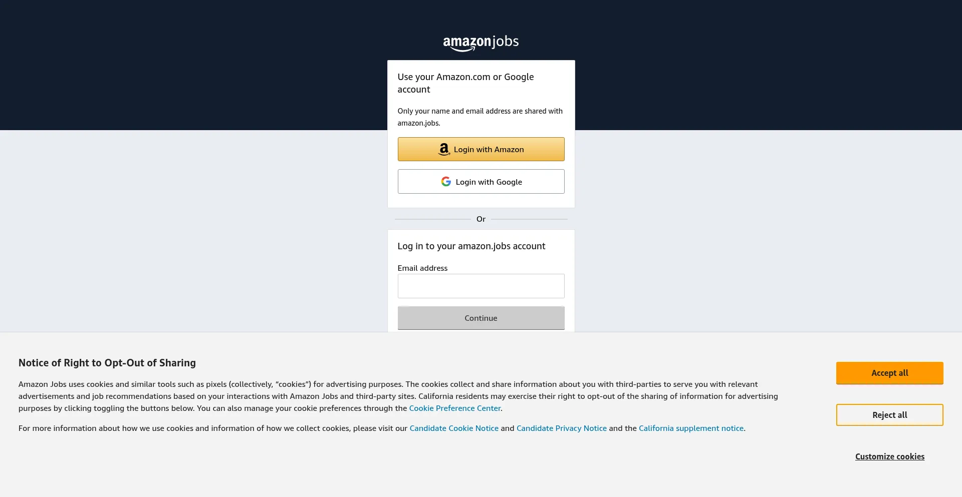 The website implements cookie consent mechanisms in compliance with privacy regulations such as GDPR or CCPA. This demonstrates that account.amazon.jobs adheres to data protection standards and provides users with control over personal data collection practices.