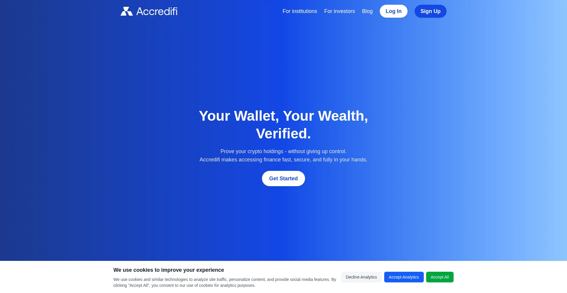 Verify your crypto wallets securely with Accredifi. Prove wallet ownership and crypto holdings without giving up control - fast, private, and trusted by institutions.