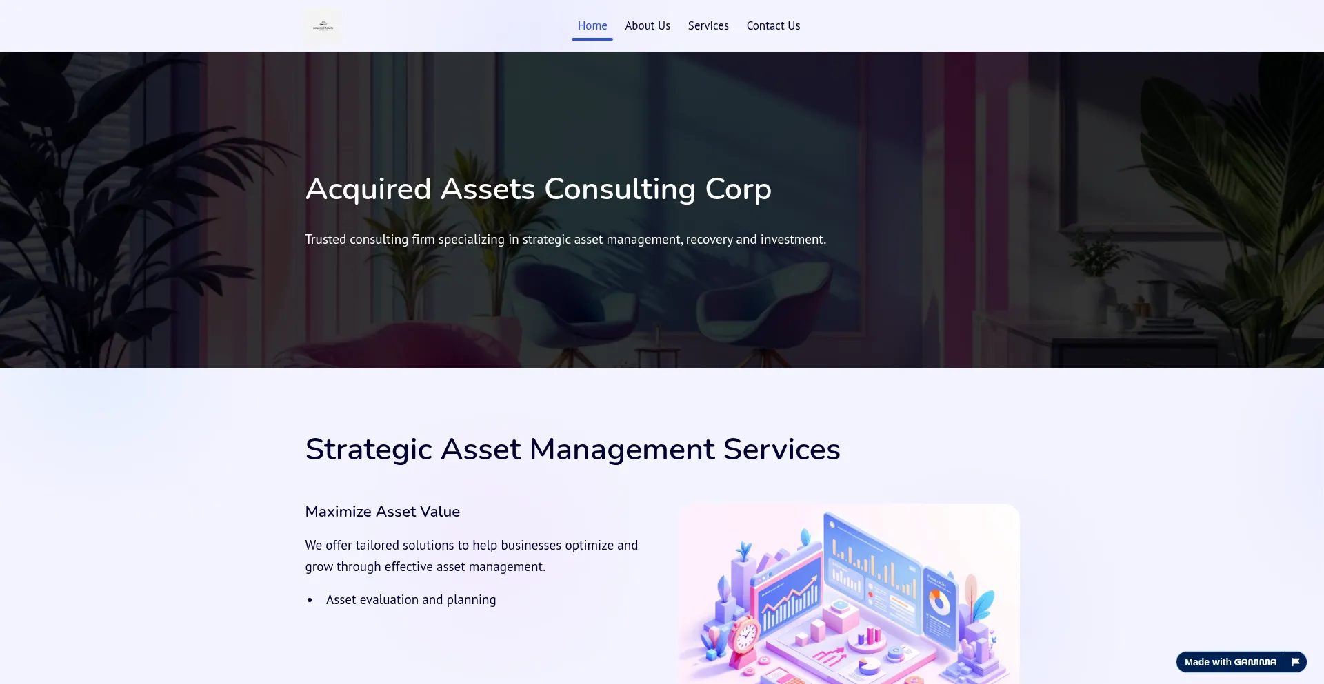 The acquiredassetsconsulting.com website provides financial services including investment management, wealth advisory, or financial planning solutions. Services may encompass portfolio management, investment opportunities, financial consulting, or asset growth strategies for individual and institutional clients.