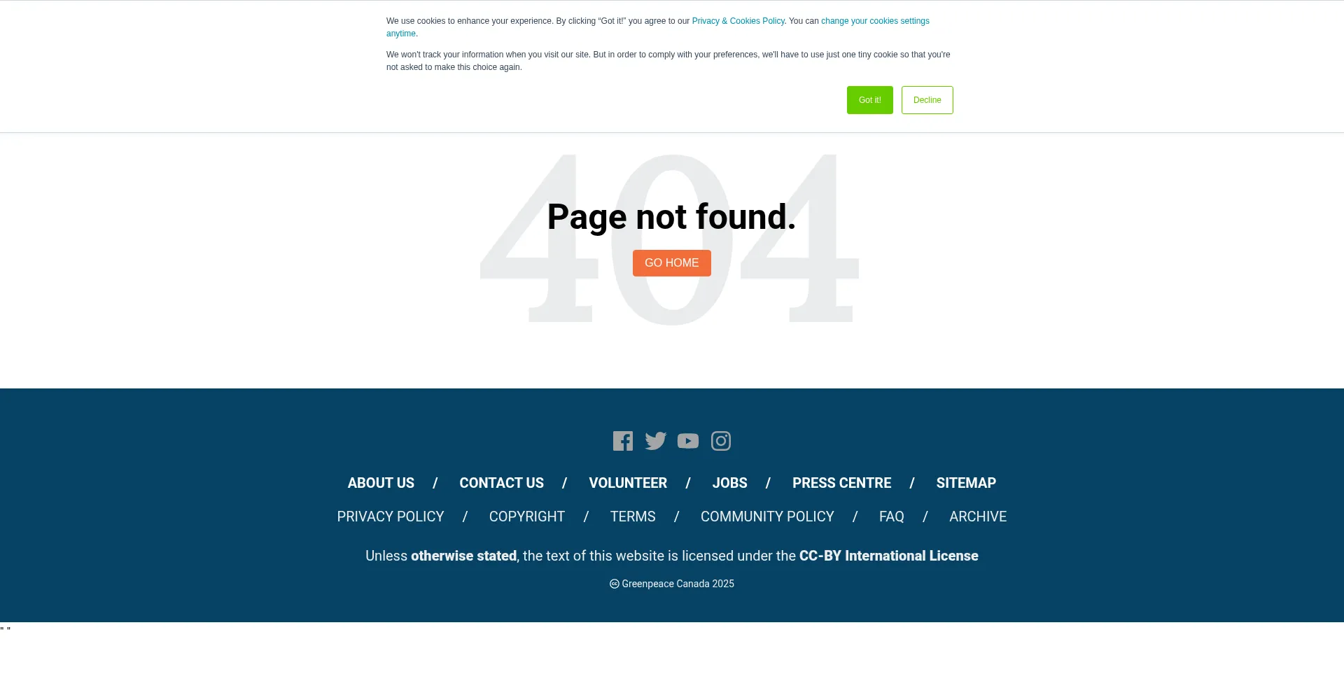 The website implements cookie consent mechanisms in compliance with privacy regulations such as GDPR or CCPA. This demonstrates that act.greenpeace.ca adheres to data protection standards and provides users with control over personal data collection practices.