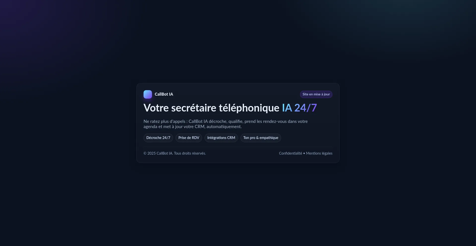 CallBot IA répond à vos appels 24/7, qualifie, prend des rendez‑vous et met à jour votre CRM.