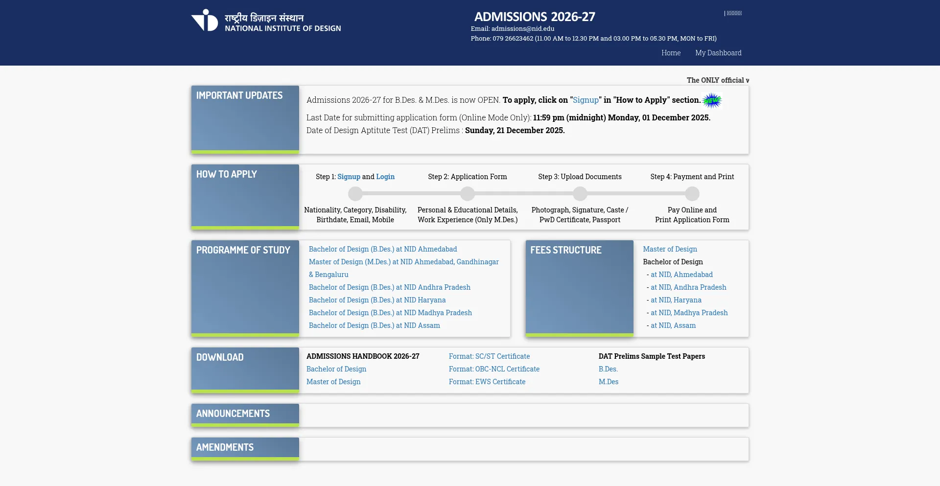 The admissions.nid.edu website implements data collection forms requesting personal information including names, email addresses, phone numbers, or other sensitive details. Users should verify the legitimacy of it and review privacy policies before submitting personal data.
