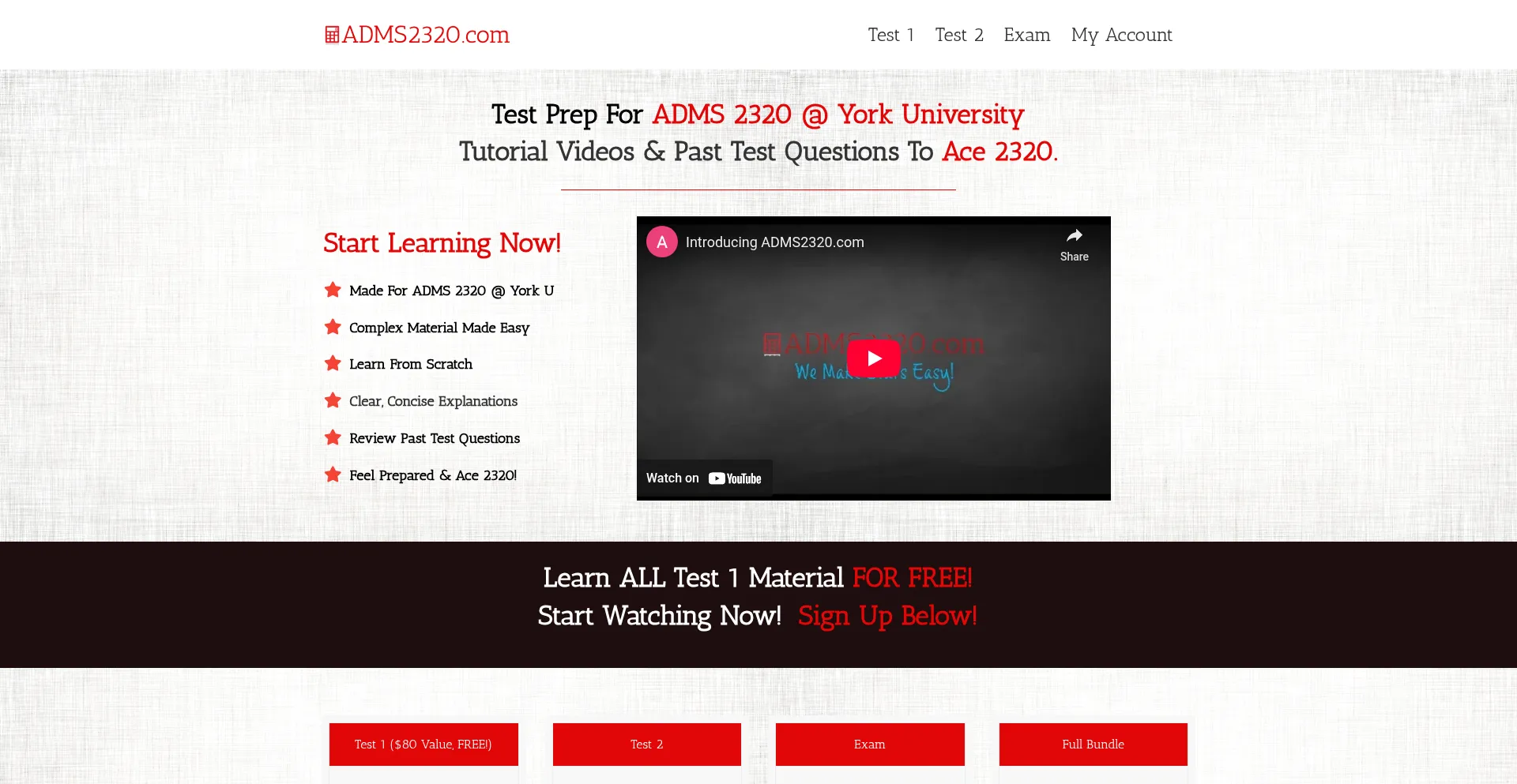 Test Prep For ADMS 2320 @ York University. Tutorial videos, Past Tests, Past Exams, Formula Sheets. Learn From Scratch. Made For Your Class.