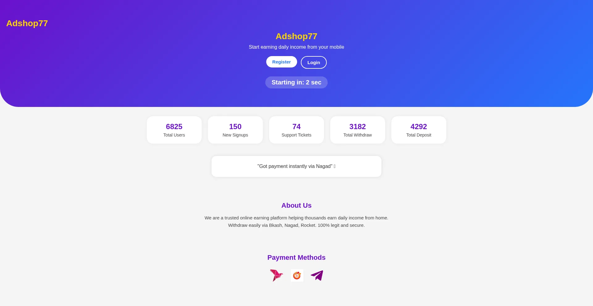 Adshop77.com operates as a suspicious website with multiple red flags that compromise its trustworthiness and user safety. The platform exhibits concerning characteristics including misleading information, questionable operational practices, or potential malware distribution that poses significant risks to visitors.