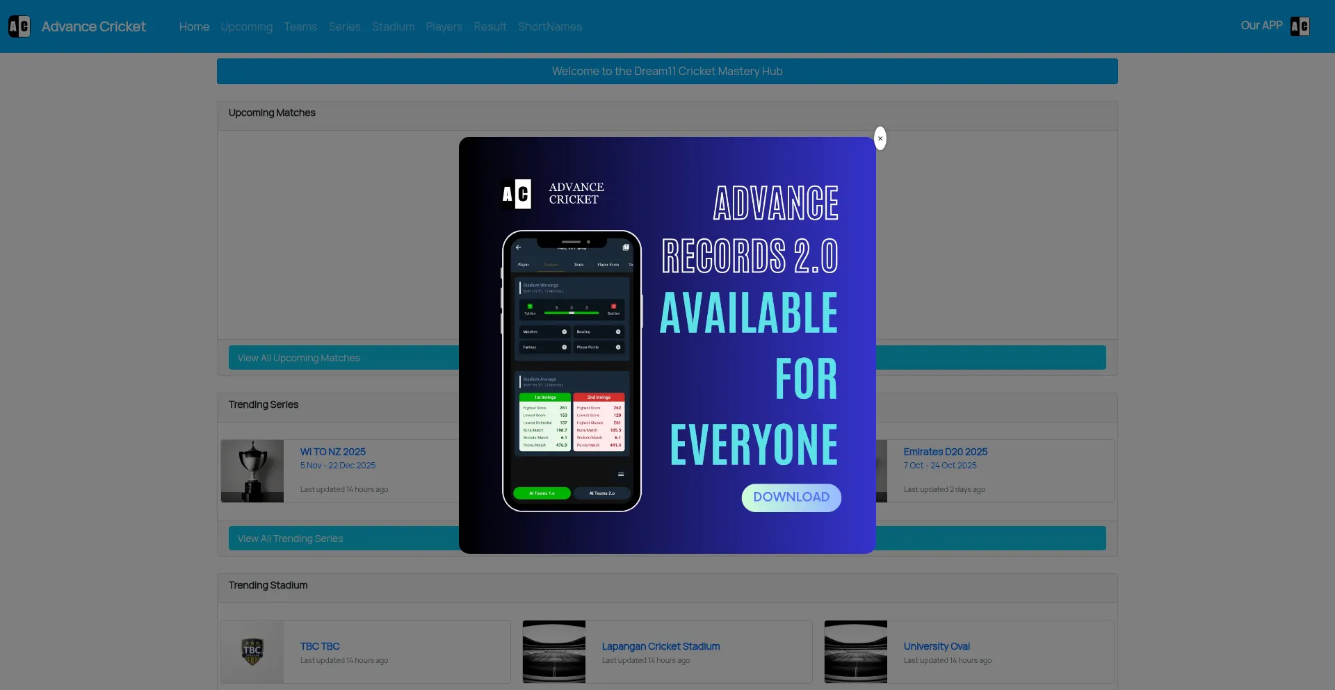 The advancecricket.com website offers a mobile application for Android devices, indicating expanded platform presence beyond web-based services.