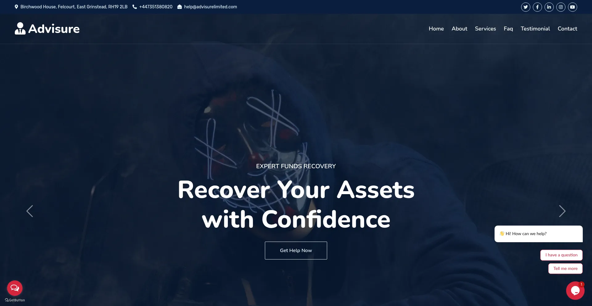 The website advisurelimited.com advertises fund recovery services for lost or stolen assets. While some operate on contingency fee structures, others may require upfront payments, which can indicate fraudulent operations. Verify credentials and regulatory compliance before engaging such services.