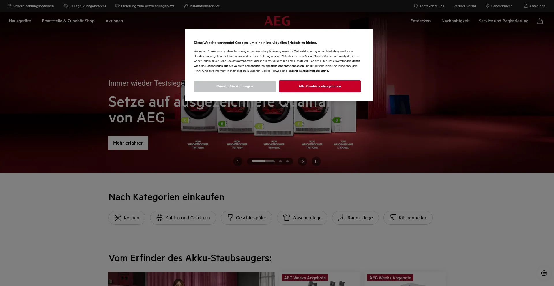 The website implements cookie consent mechanisms in compliance with privacy regulations such as GDPR or CCPA. This demonstrates that aeg.de adheres to data protection standards and provides users with control over personal data collection practices.