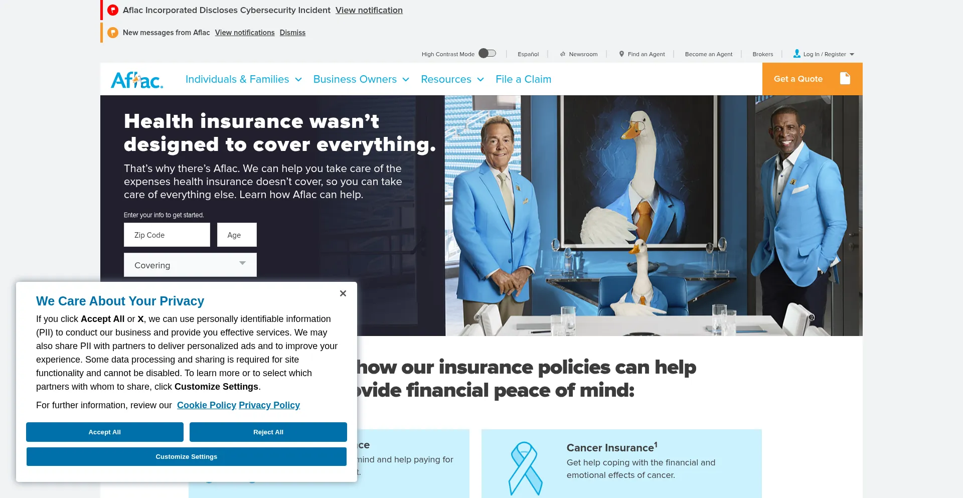 The website implements cookie consent mechanisms in compliance with privacy regulations such as GDPR or CCPA. This demonstrates that aflac.com adheres to data protection standards and provides users with control over personal data collection practices.