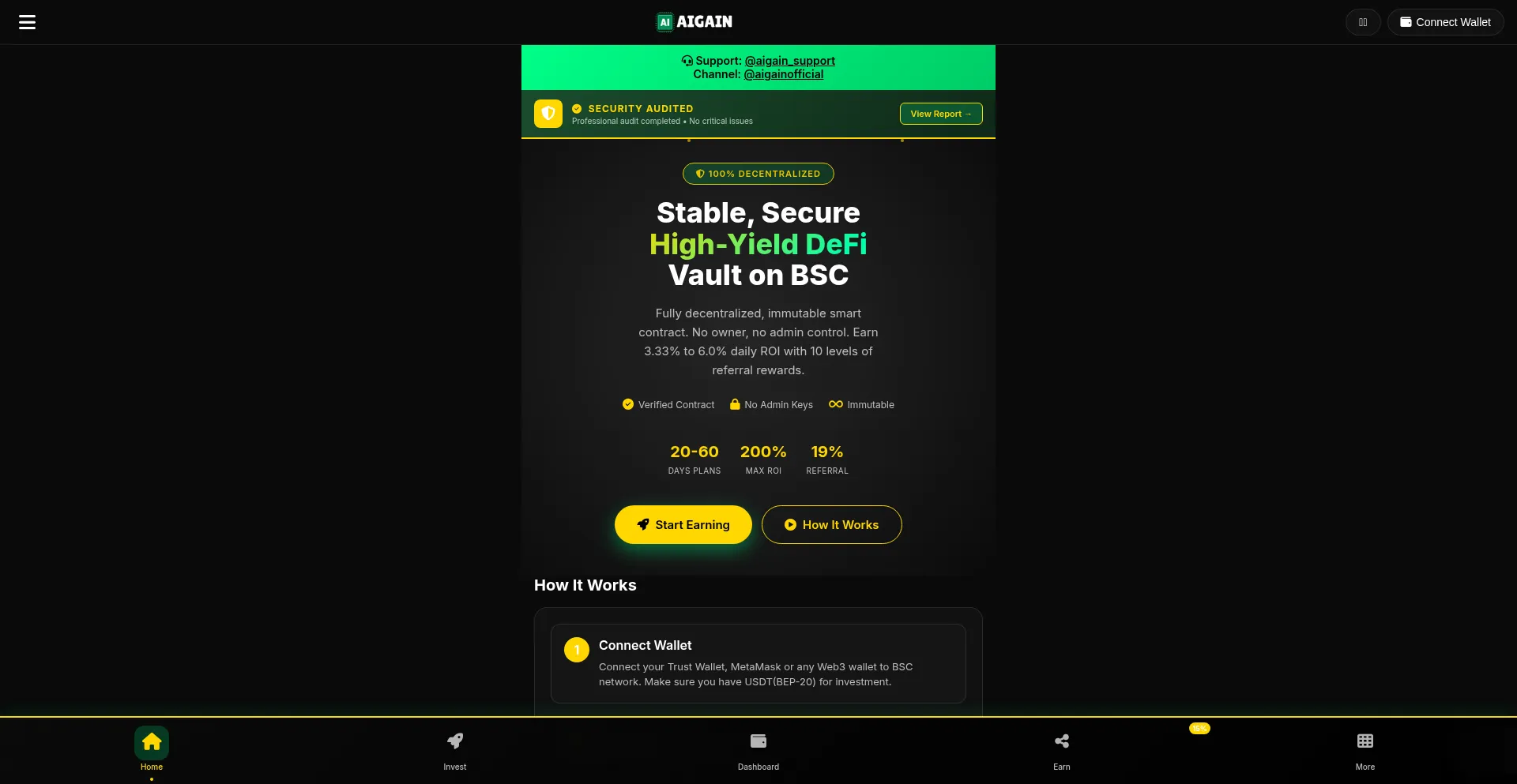 Fully Decentralized, Stable, Secure & High-Yield DeFi Vault on BSC. Earn 3.33% to 6.0% Daily ROI with complete transparency and security. Plus, get a 19% Referral Bonus across u...