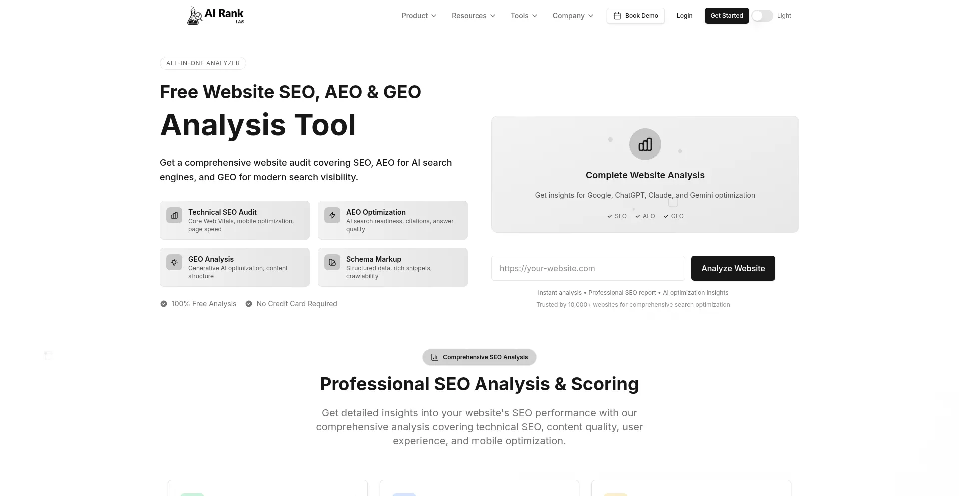 Get comprehensive free SEO, AEO (Answer Engine Optimization), and GEO (Generative Engine Optimization) analysis with AI Rank Lab. Optimize for Google, ChatGPT, Claude, Gemini an...