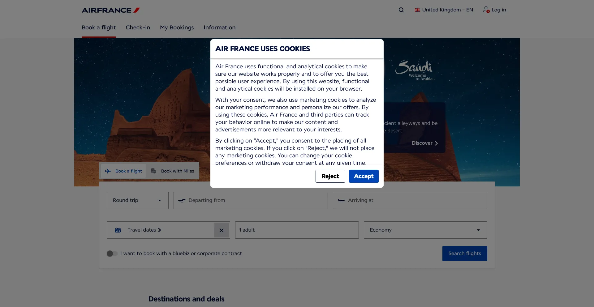 The website implements cookie consent mechanisms in compliance with privacy regulations such as GDPR or CCPA. This demonstrates that airfrance.co.uk adheres to data protection standards and provides users with control over personal data collection practices.