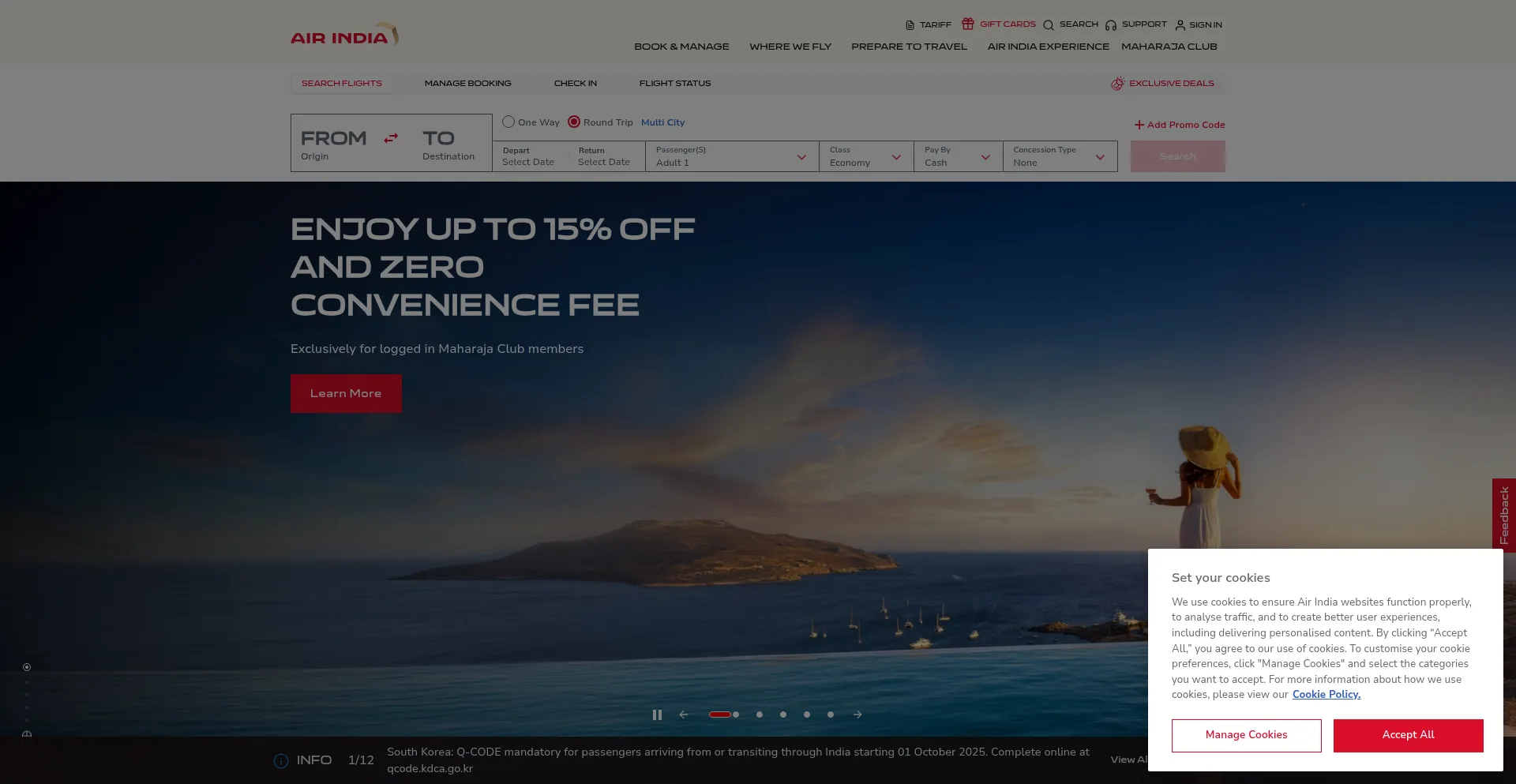 The website implements cookie consent mechanisms in compliance with privacy regulations such as GDPR or CCPA. This demonstrates that airindia.in adheres to data protection standards and provides users with control over personal data collection practices.