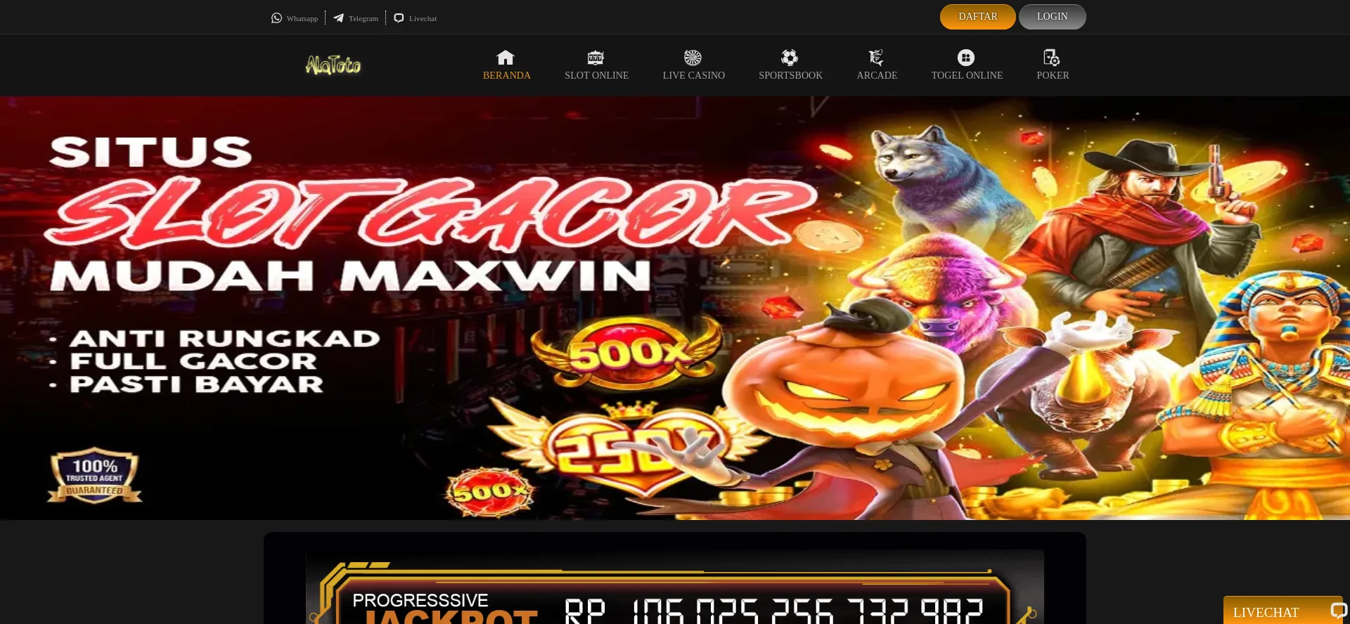 ALATOTO merupakan link alternatif situs Ala Toto permainan online resmi terbaik di seluruh Indonesia dengan bonus deposit setiap harinya.