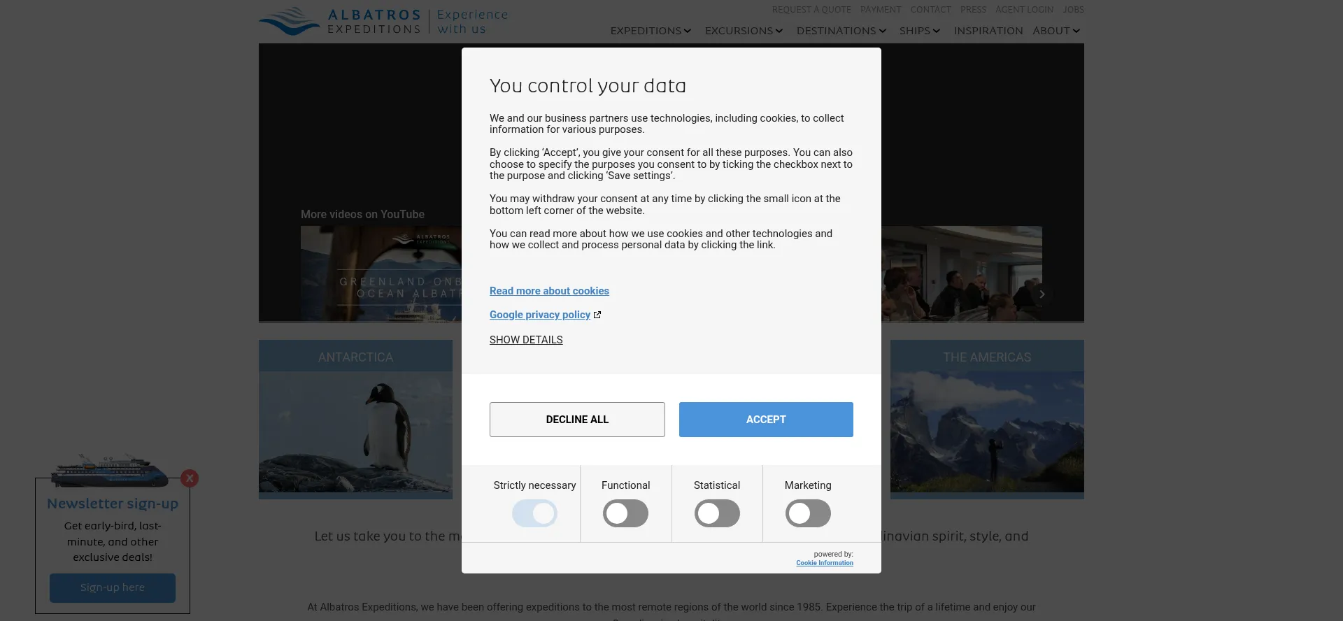 The website implements cookie consent mechanisms in compliance with privacy regulations such as GDPR or CCPA. This demonstrates that albatros-expeditions.com adheres to data protection standards and provides users with control over personal data collection practices.