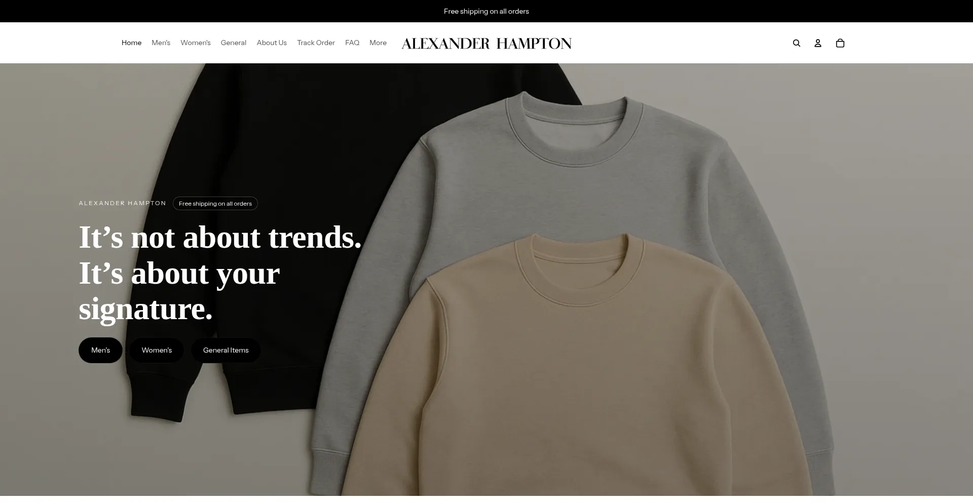 Analysis indicates that alexander-hampton.com operates as an e-commerce platform facilitating online transactions for goods or services. The website implements shopping cart functionality, payment processing systems, and product catalog features typical of commercial retail operations.
