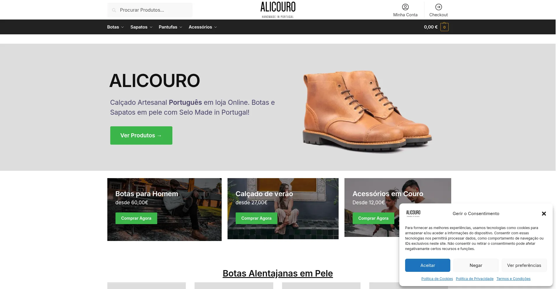 Analysis indicates that alicouro.pt operates as an e-commerce platform facilitating online transactions for goods or services. The website implements shopping cart functionality, payment processing systems, and product catalog features typical of commercial retail operations.