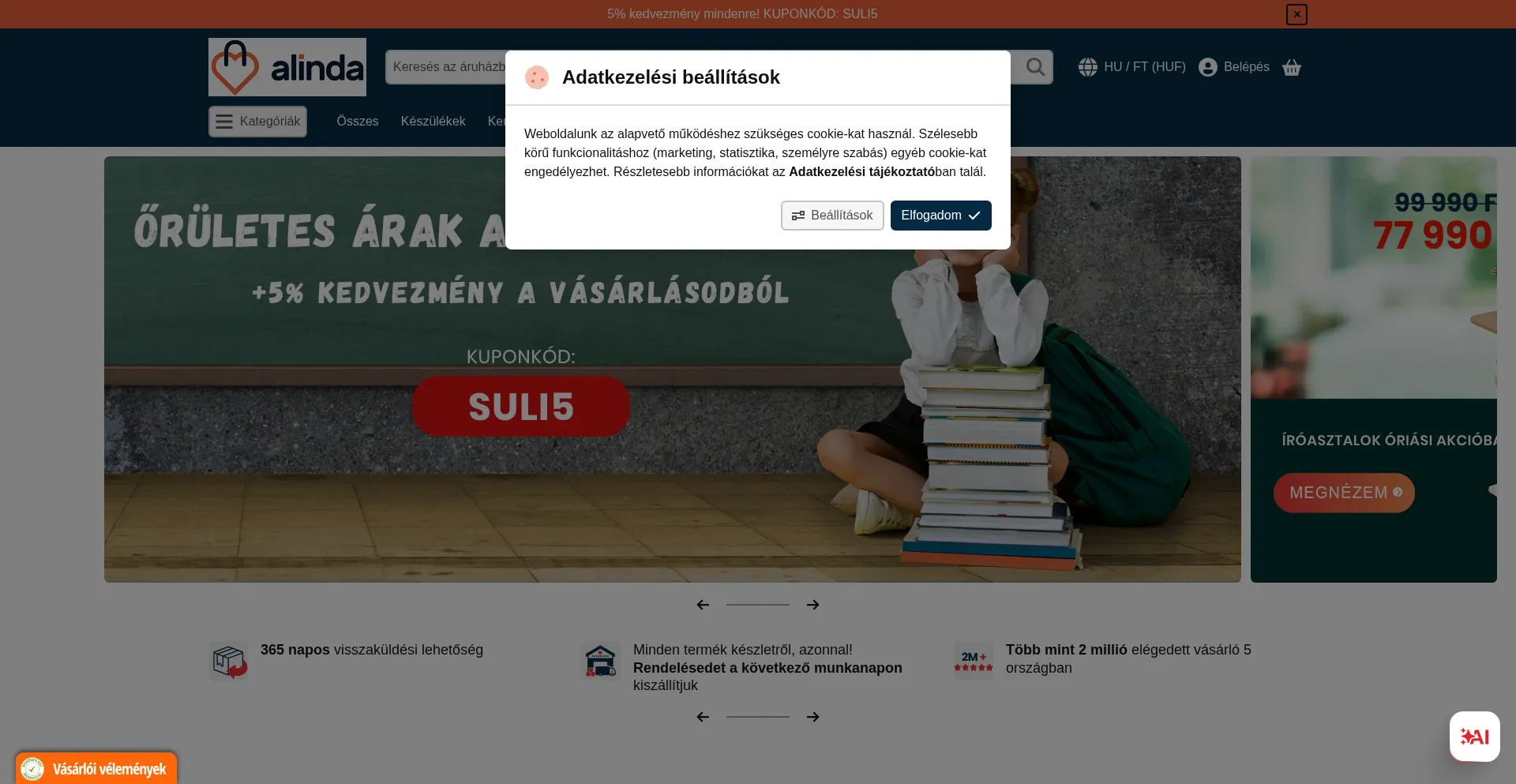 Analysis indicates that alinda.hu operates as an e-commerce platform facilitating online transactions for goods or services. The website implements shopping cart functionality, payment processing systems, and product catalog features typical of commercial retail operations.