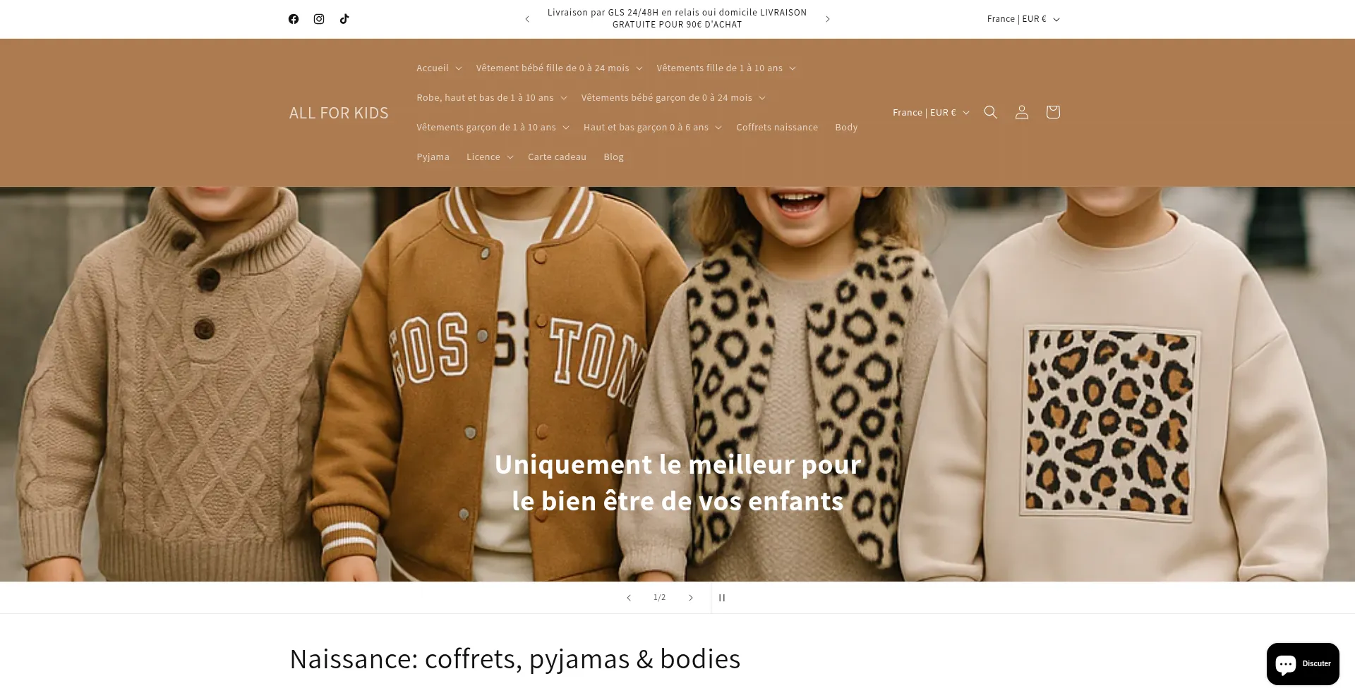 The allforkids.fr website utilizes free e-commerce platform solutions, which may indicate cost-conscious operations but could also suggest limitations in security features, customer support, or advanced functionality compared to enterprise-grade solutions.