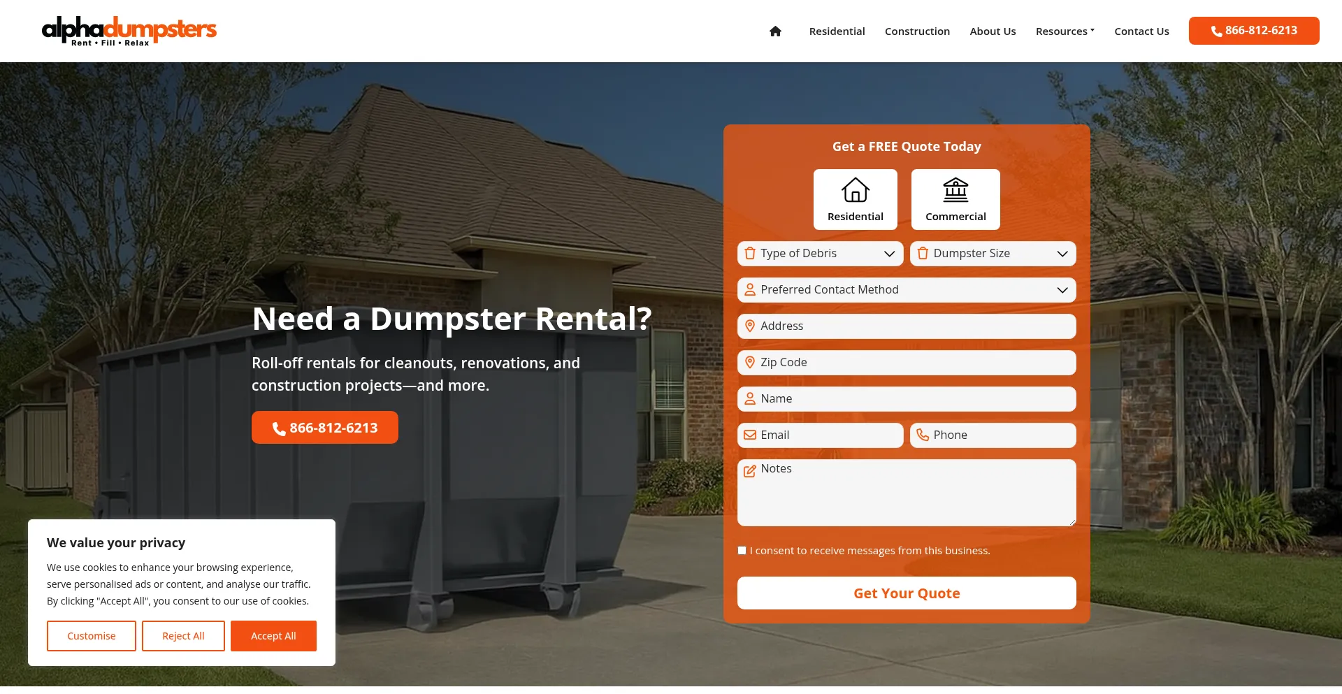 The website implements cookie consent mechanisms in compliance with privacy regulations such as GDPR or CCPA. This demonstrates that alphadumpsters.com adheres to data protection standards and provides users with control over personal data collection practices.
