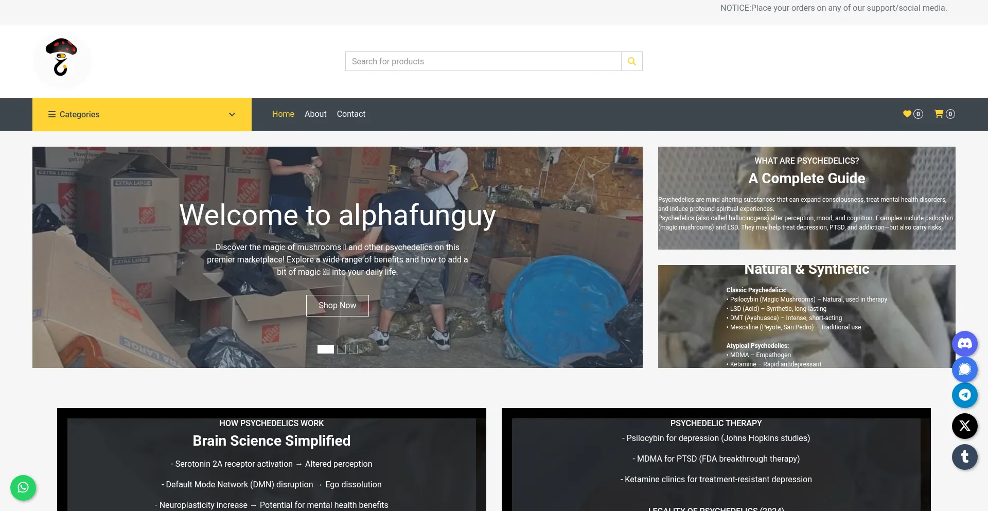 Analysis indicates that alphafunguy.com operates as an e-commerce platform facilitating online transactions for goods or services. The website implements shopping cart functionality, payment processing systems, and product catalog features typical of commercial retail operations.