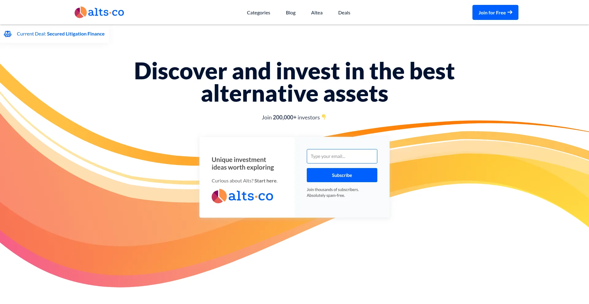 Alts is an alternative investment platform for private markets, unique financing deals & esoteric assets. Join the worlds largest alternative investor community.