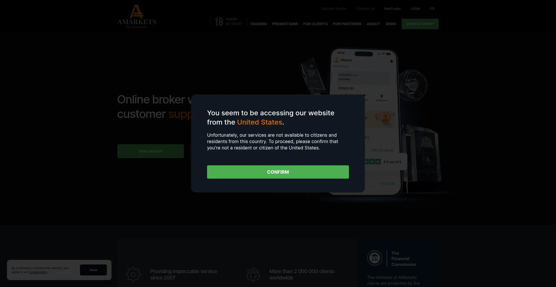 The website implements cookie consent mechanisms in compliance with privacy regulations such as GDPR or CCPA. This demonstrates that amarkets.com adheres to data protection standards and provides users with control over personal data collection practices.