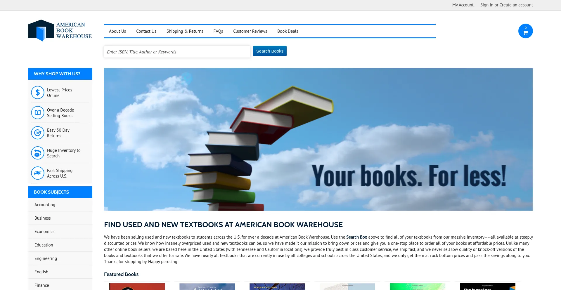 American Book Warehouse – We are the number 1 place to find cheap textbooks online. Visit us to buy used textbooks, college textbooks. We focus on student needs in the United ...