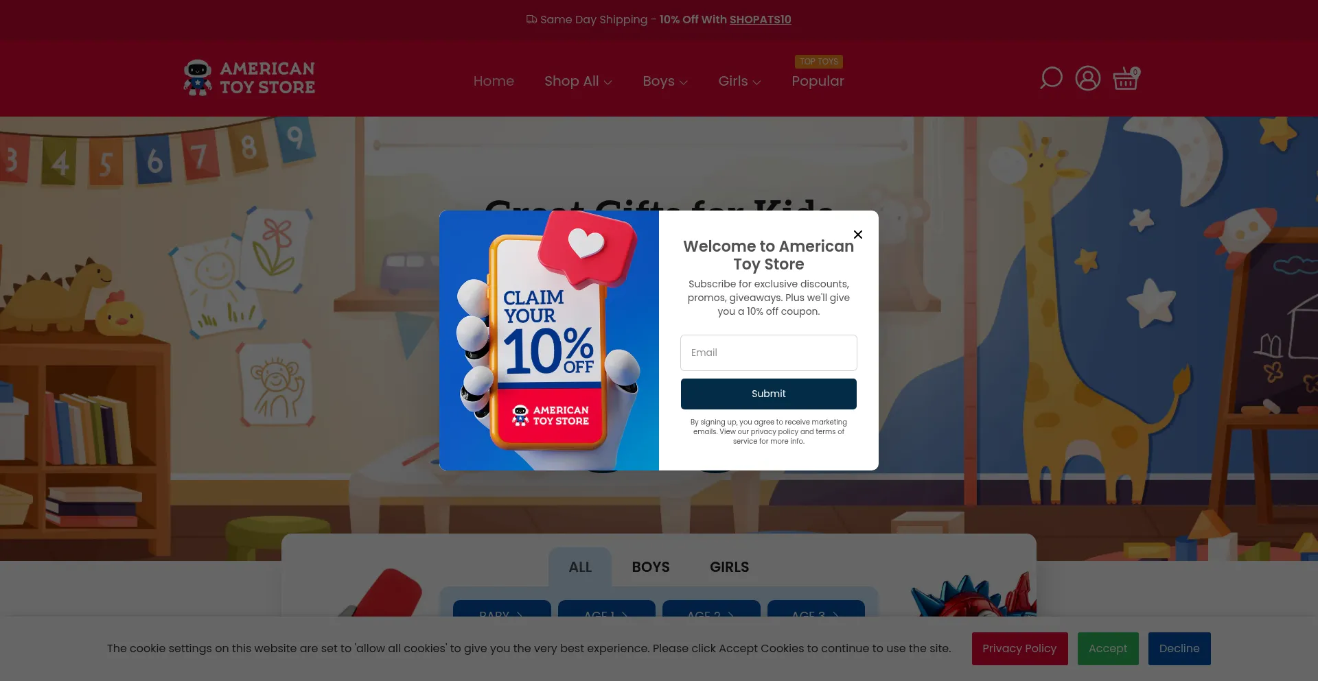 The website implements cookie consent mechanisms in compliance with privacy regulations such as GDPR or CCPA. This demonstrates that americantoystore.com adheres to data protection standards and provides users with control over personal data collection practices.