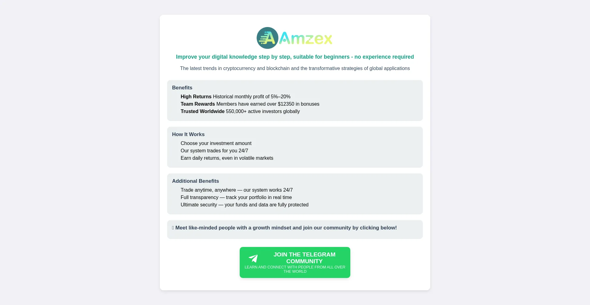 The amzex.site website references cryptocurrency transactions or educational content related to digital assets such as Bitcoin, Ethereum, or other blockchain-based currencies. Users should exercise caution as cryptocurrency transactions are irreversible and the decentralized nature of these assets provides limited recourse for fraudulent activities.