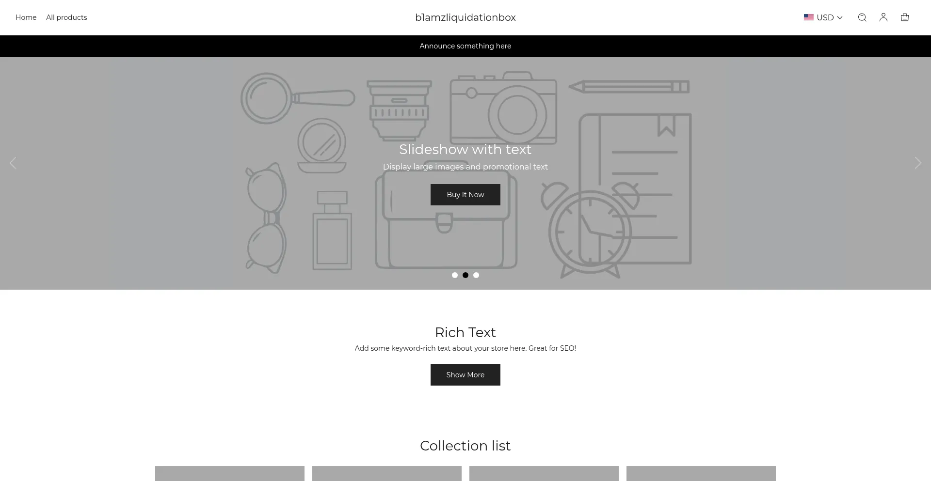 The amzliquidationbox.com website contains incomplete elements including placeholder content, unfinished features, or development artifacts, indicating ongoing construction or maintenance. This may reflect inadequate quality assurance processes or premature deployment, potentially affecting site reliability and user experience.