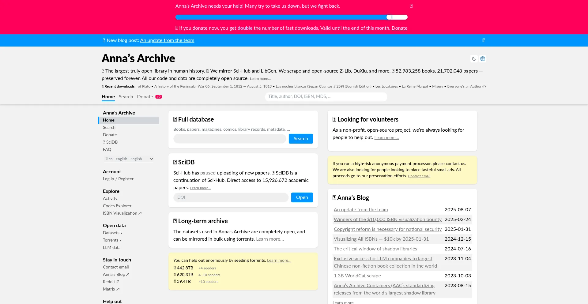 The world’s largest open-source open-data library. Mirrors Sci-Hub, Library Genesis, Z-Library, and more.