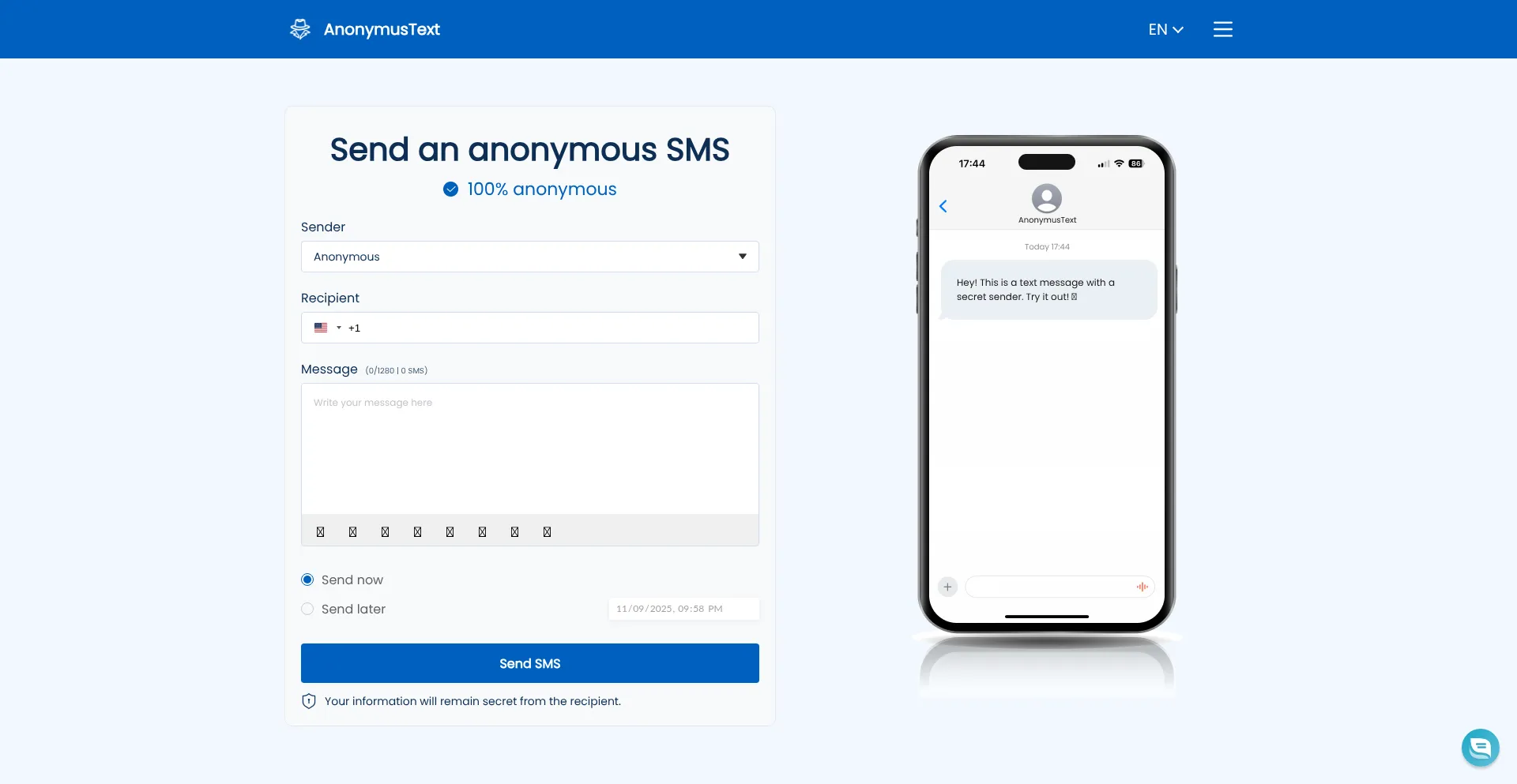 Send anonymous text with Anonymustext. Send anyone a message without your name being attached to it. Send anonymous SMS easily and fast.