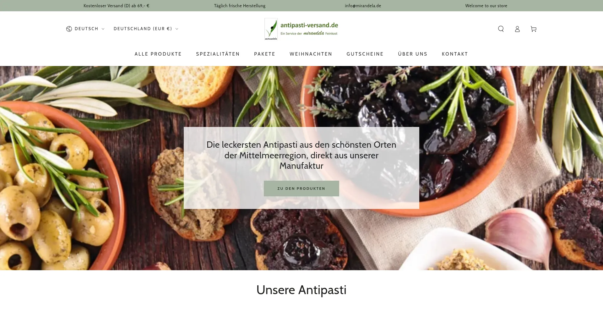 Analysis indicates that antipasti-versand.de operates as an e-commerce platform facilitating online transactions for goods or services. The website implements shopping cart functionality, payment processing systems, and product catalog features typical of commercial retail operations.