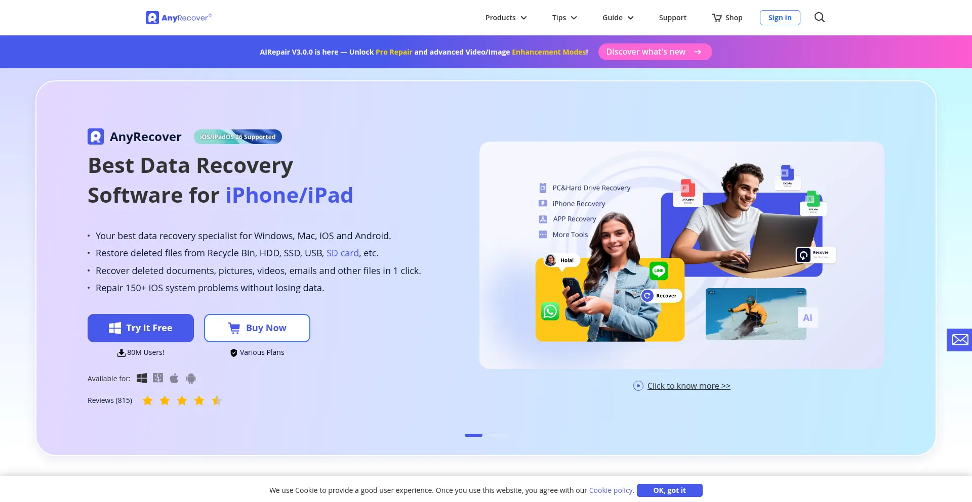 iMyFone AnyRecover, the best data recovery software to recover lost, deleted, formatted data like files,videos,pics from Windows/Mac/iPhone/Android devices, SD card & hard drive.