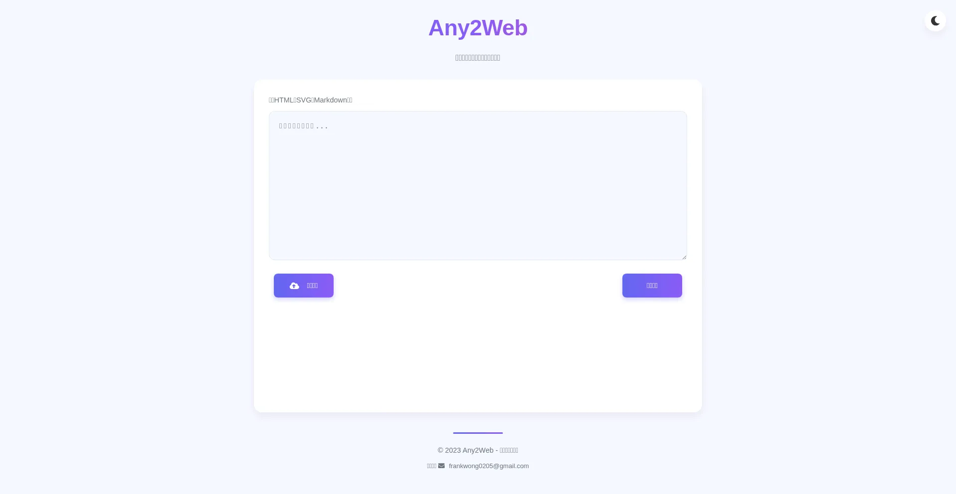 Any2Web是一款专业的代码转网页工具,支持HTML、SVG、Markdown格式转换,提供即时预览和一键分享功能。免费、快速、安全的在线代码分�...