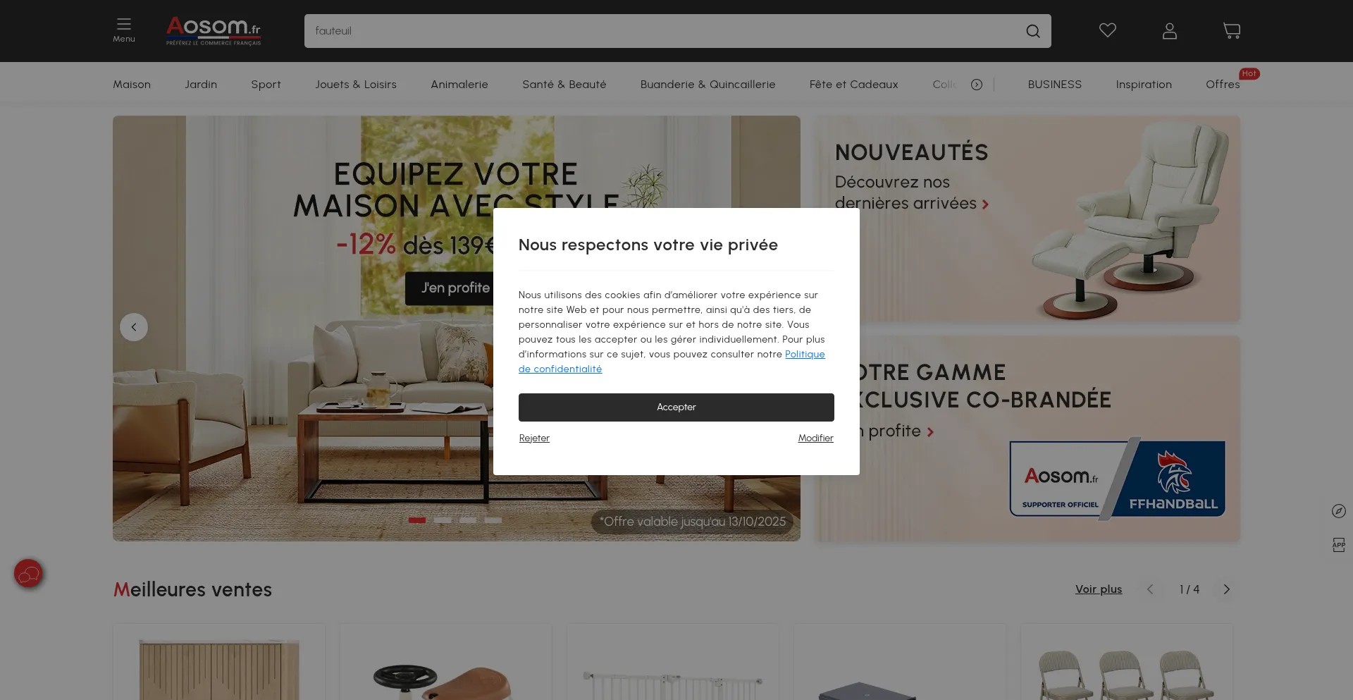 Analysis indicates that aosom.fr operates as an e-commerce platform facilitating online transactions for goods or services. The website implements shopping cart functionality, payment processing systems, and product catalog features typical of commercial retail operations.