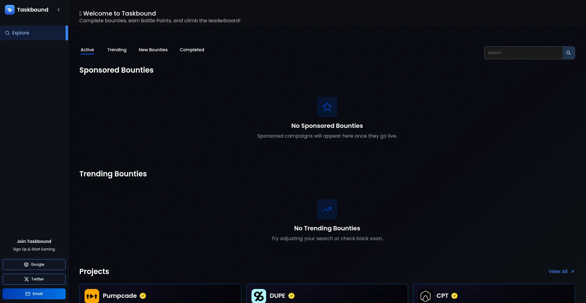 Taskbound - Complete bounties, earn Battle Points, and climb the leaderboard! Join the gamified task completion platform for Twitter, Telegram, and Crypto tasks.